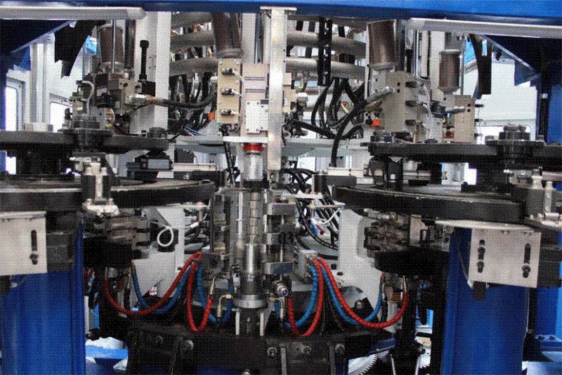 吹瓶部分實施了機械手雙層軌道曲線設計、吹瓶機模號加裝壓力檢測裝置、主吹輪氣源進出采用旋轉式動靜密封氣套(發明專利產品)、吹瓶機主吹輪采用旋轉式機械補償水套等多項技改措施,大大加強了吹瓶運行的安全性、穩定性,并延長了關鍵部件的使用壽命。